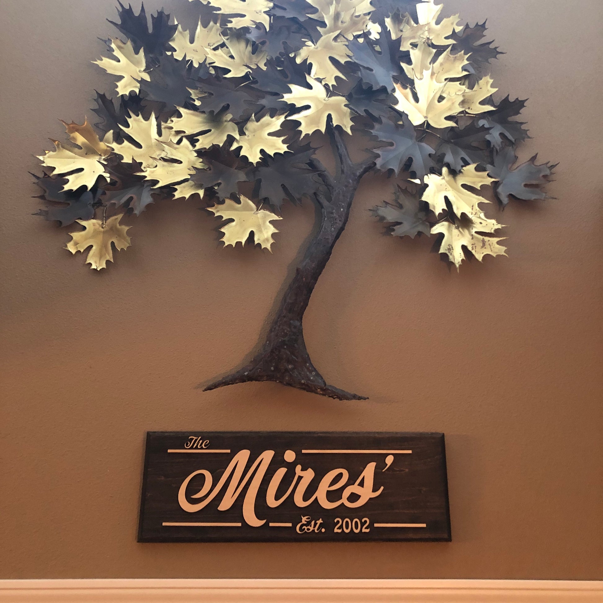 Introducing the newest piece in the Enchanted Memories line of quality products. This custom 20"x7" basswood sign board is beautifully stained with a deep, rich expresso stain. The letters are then laser cut from birch plywood and attached to give this custom piece a 3-dimensional look. This personalized family name sign is the perfect personalized wedding gift and a WOW gift to celebrate any house warming.