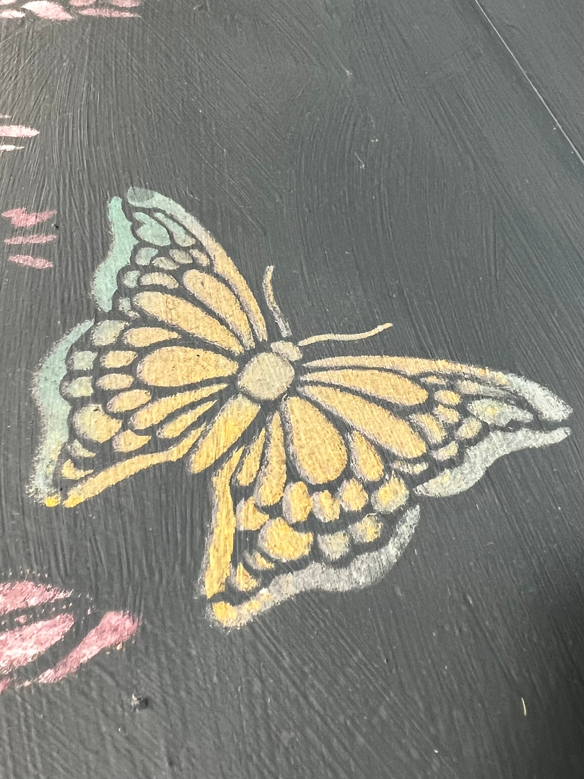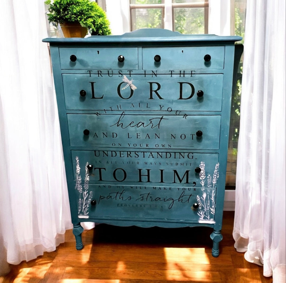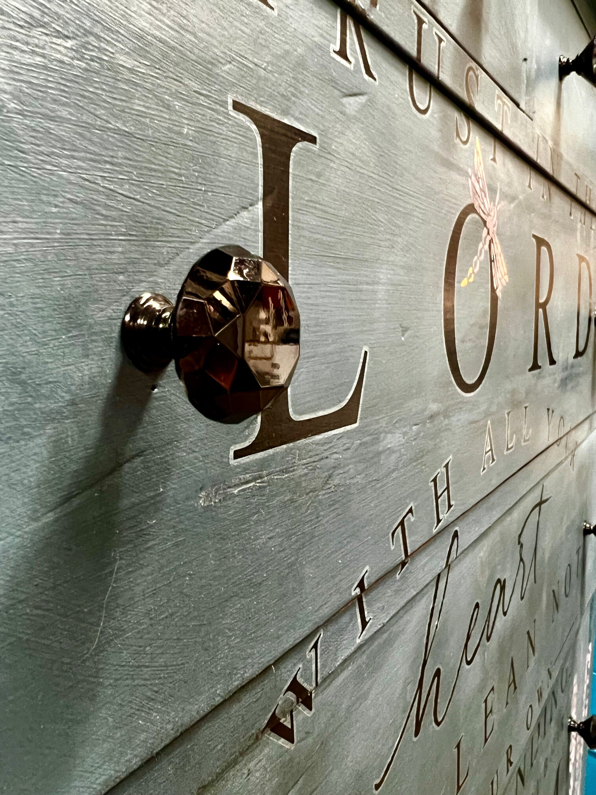 The dovetailed drawers have been repaired, waxed, and make like new again. There are also 12 new knobs that adorn the front of each beautifully sliding drawer. She also has her key from oh so long ago!