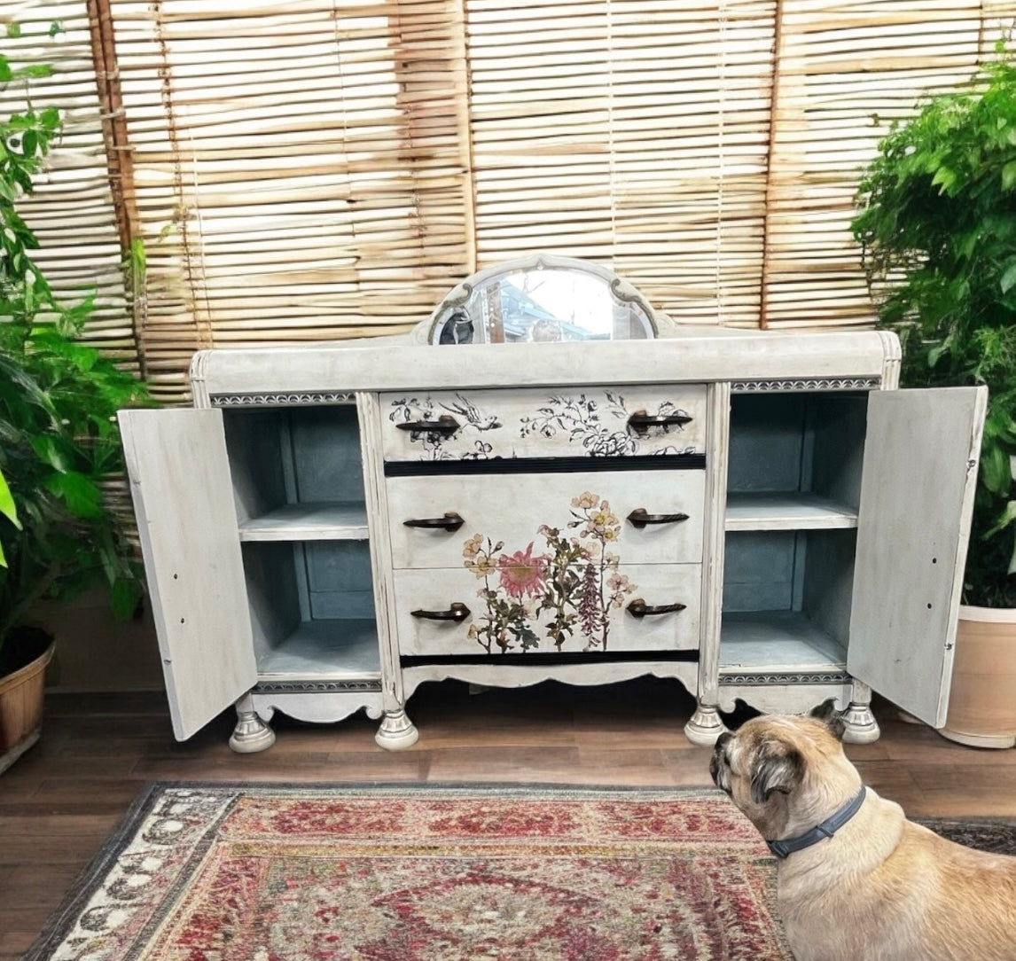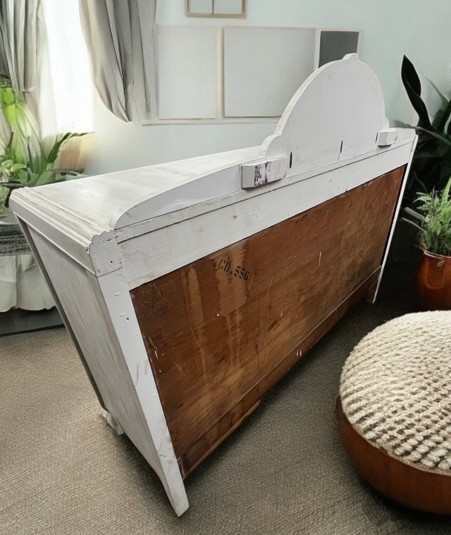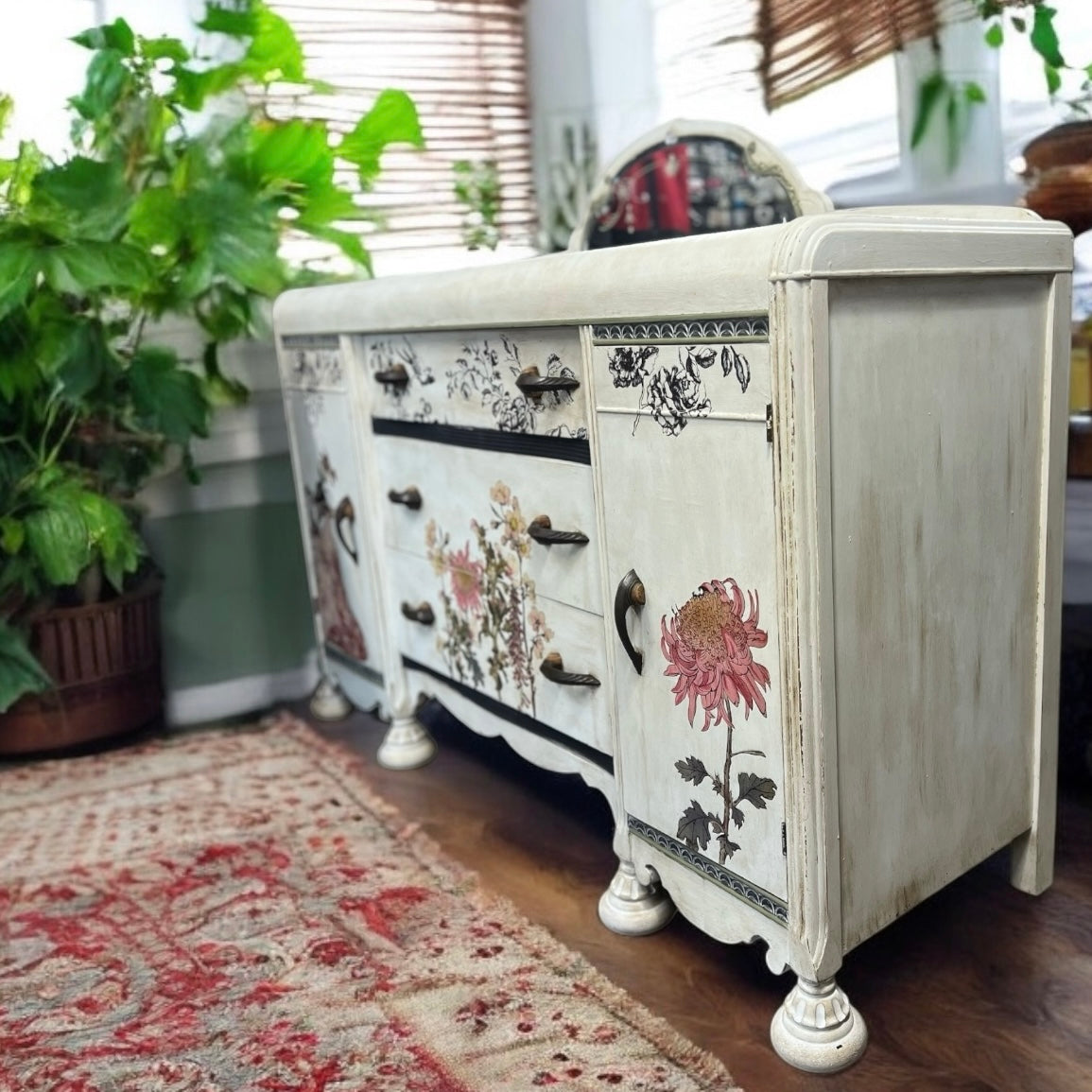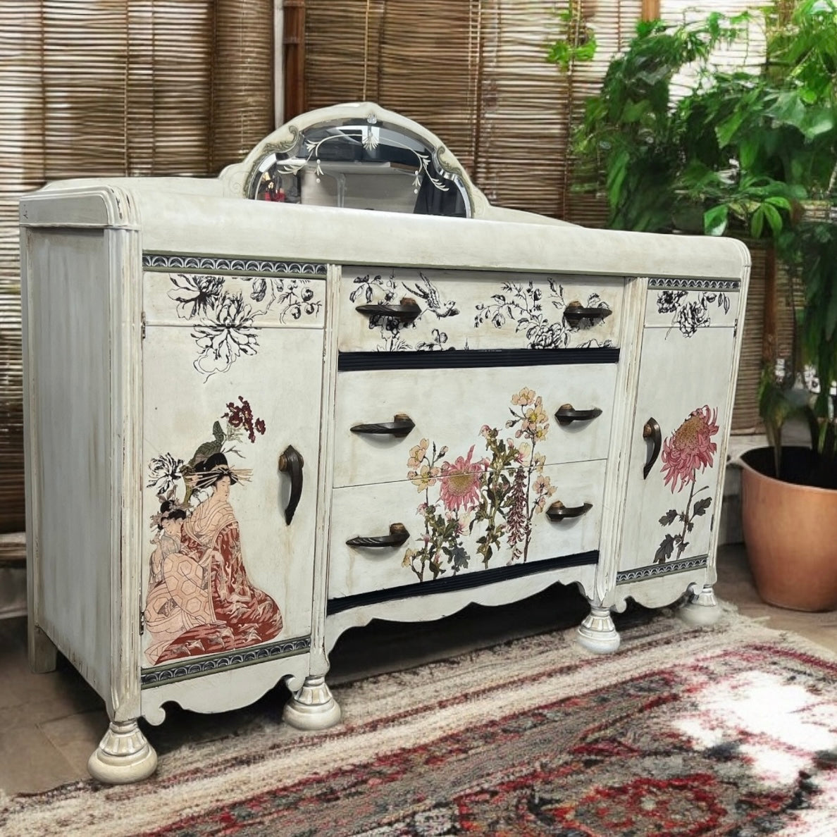 Vintage hand painted Basset Buffet/Sideboard with lovely Geisha Girl Japanese Transfers. This piece was refinished to keep the age and character visible. It is not perfect, but has much charm as a piece of this age could hold! Price reflects imperfections. She is very stable, and the drawers and doors function as they should.