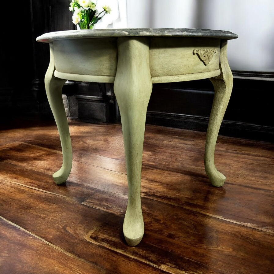Reloved in the stunning Annie Sloan Chalk Paint Color, Chateau Gray, this light green table is truly stunning. With a Mint by Michelle Decoupage of Roses beautifully placed on top, this piece is sure to fit any room of a rose lovers home. Diameter is 24'.
