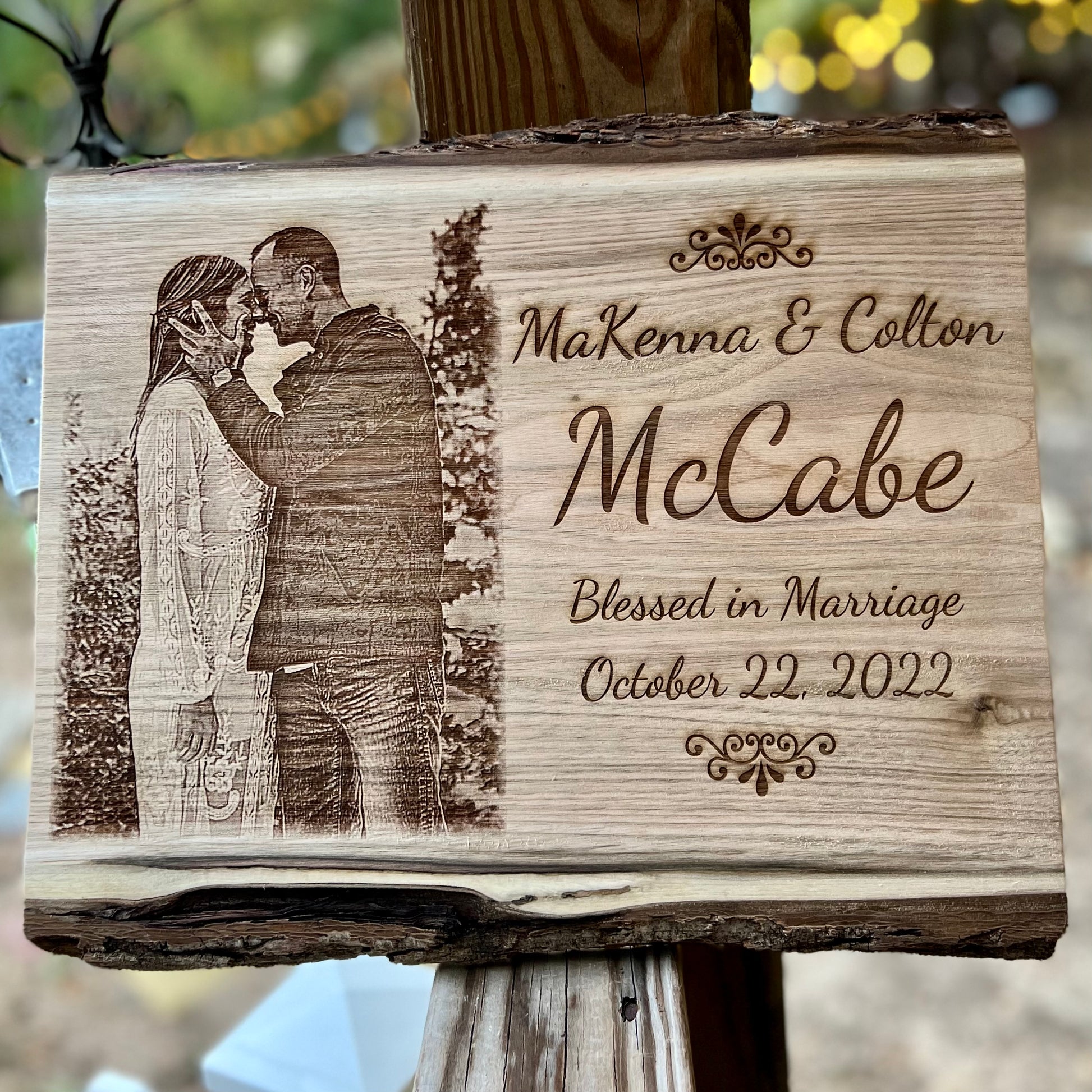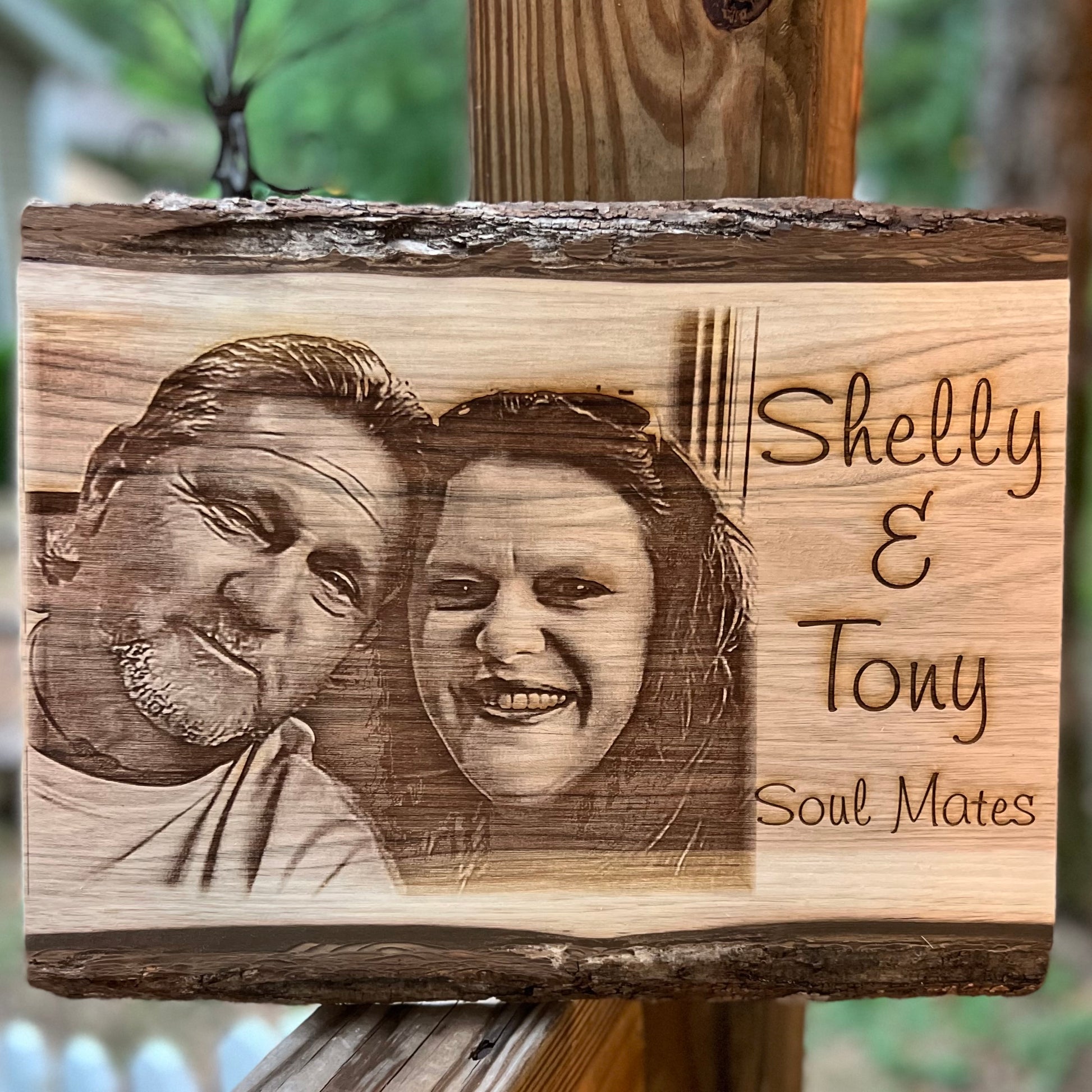 Our Personalized Couple's Wooden Photo Plaques are sized 9"-12" x 14", and are perfect for engraving any photo. They are made of solid Butternut with the bark left on for that timeless rustic look. These engraved pieces make the perfect gift for yourself or a special couple in your life. What a lovely personalized wedding or anniversary photo gift!
