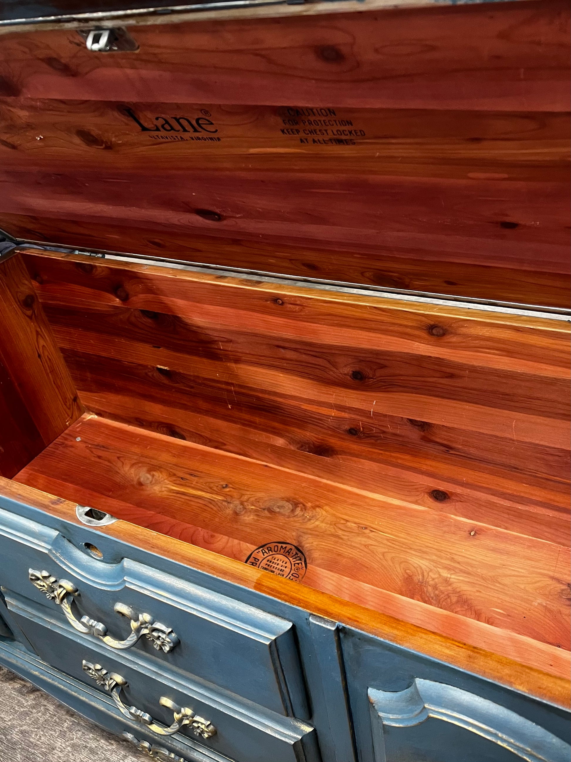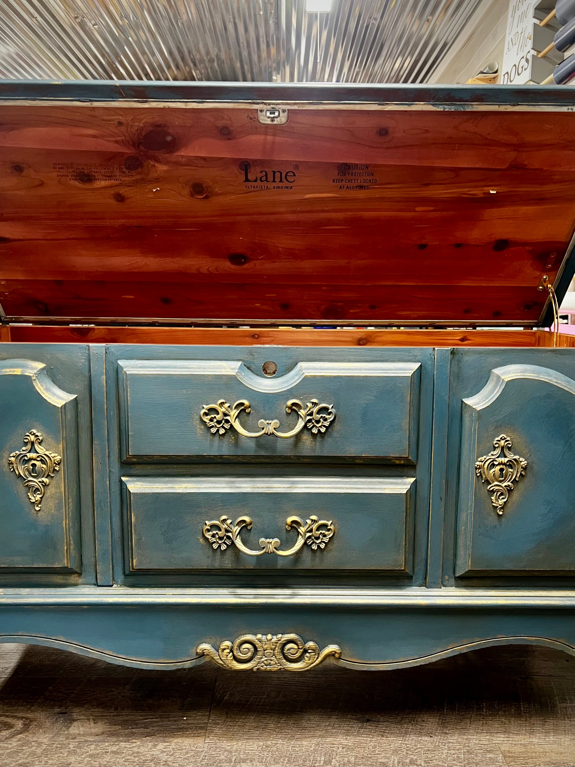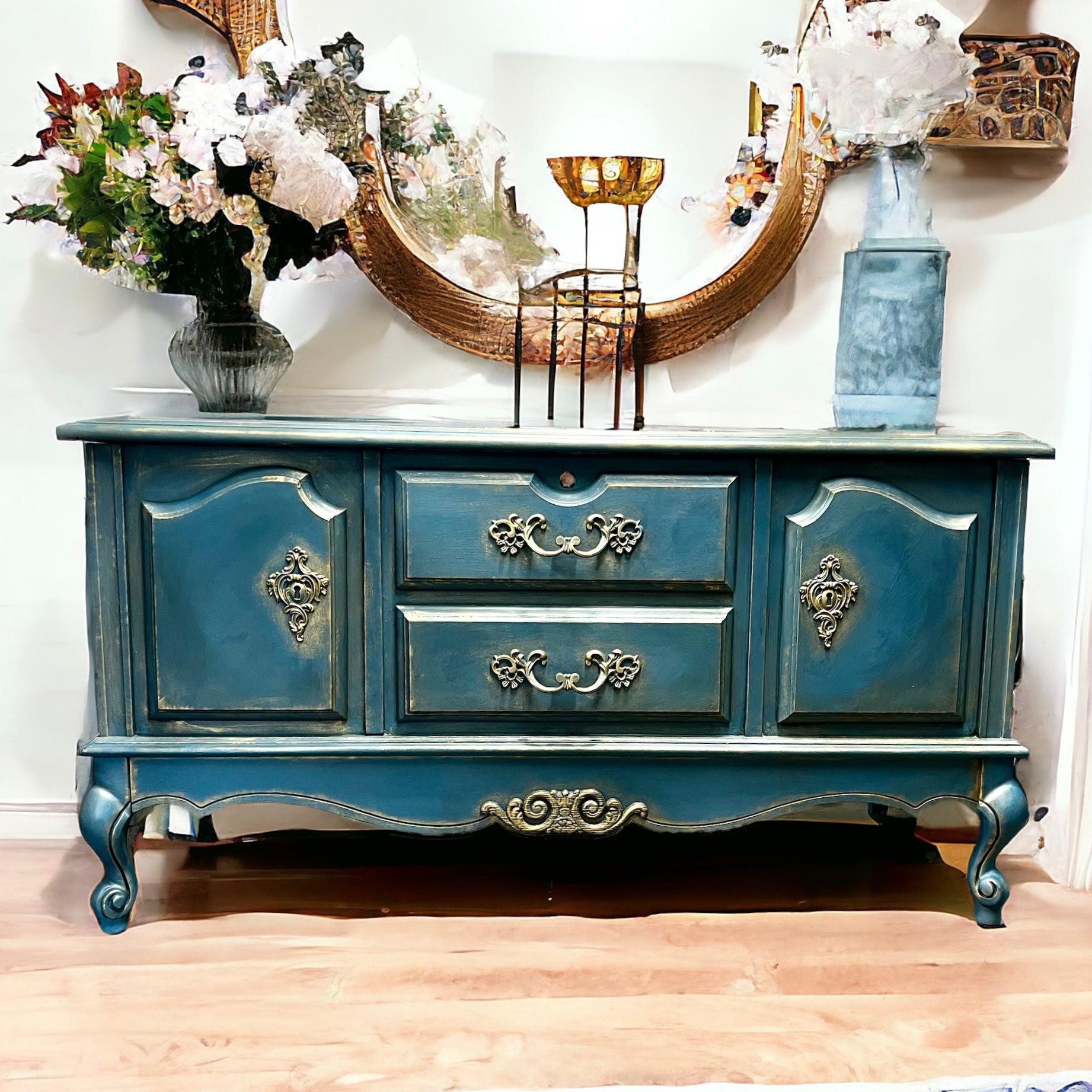 SOLD!!! Hand painted in a gorgeous blue Chalk Paint®️ by Annie Sloan to guarantee the longest lasting color and wear! Gold gilding wax has been added to the details and those “just right” spots. This piece was outdated by several decades but has now been updated to look fabulous in any room or with any decor.