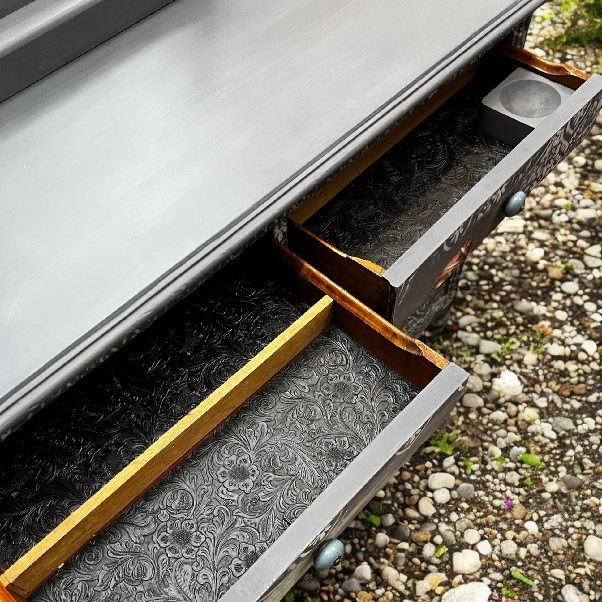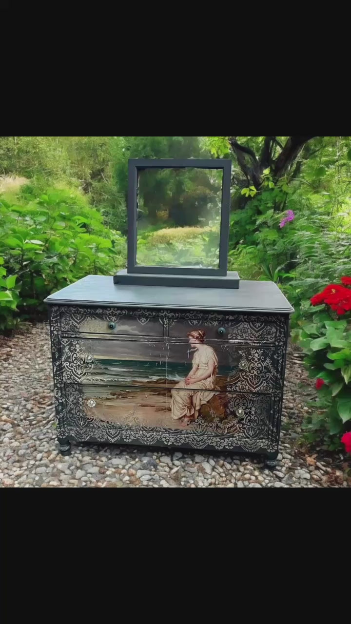 Reloved in the stunning Annie Sloan Chalk Paint Color, Whistler Gray, complete with a beautiful girl by the sea decoupage and a lovely stencil and distressing completes the look.