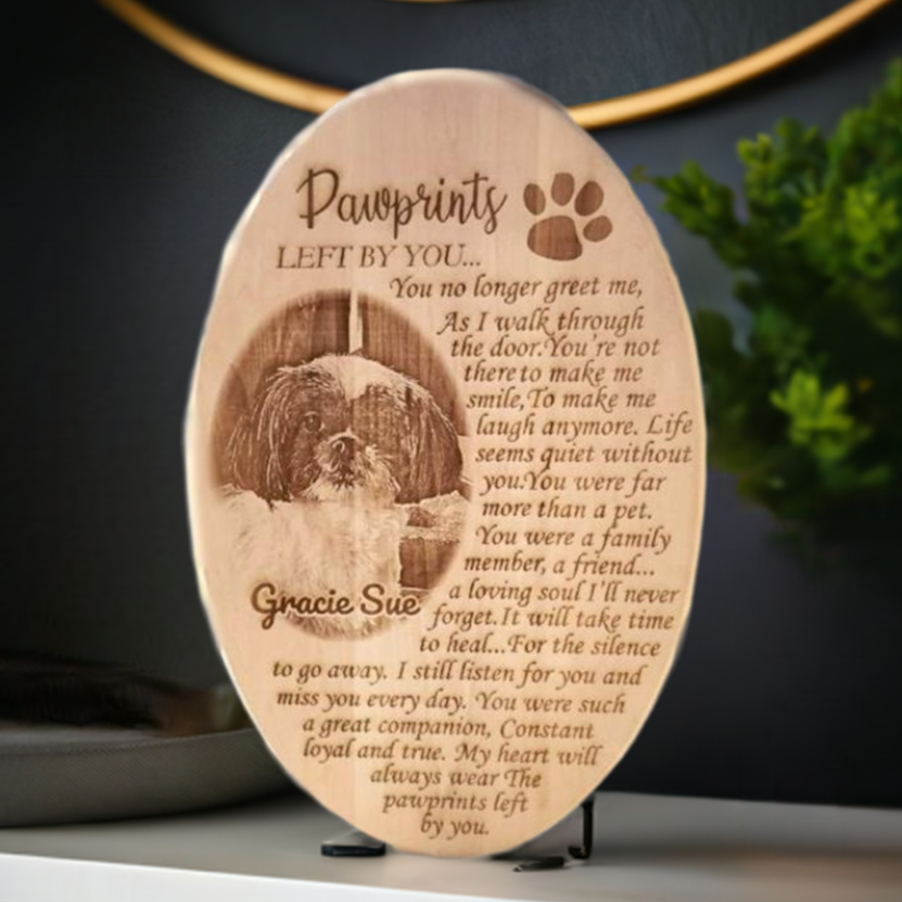 These solid Basswood Oval Photo Plaques are perfect to commemorate your beloved pet. Sized 6"x9" and 8"x12", and 12"x18", there's plenty of room to have your favorite photograph and special wording engraved, making it a truly stunning piece.
