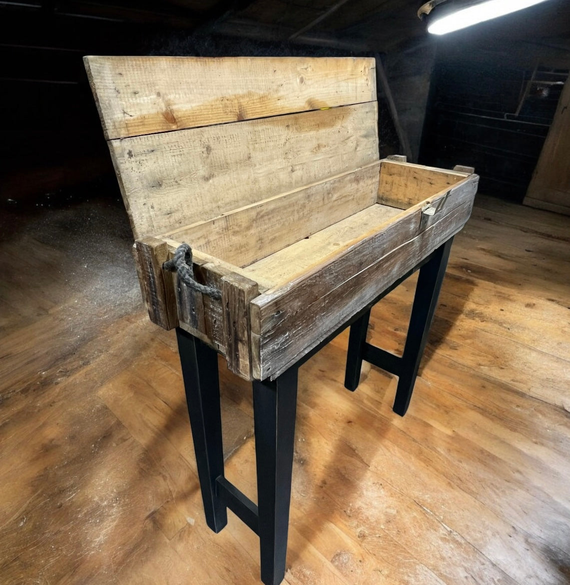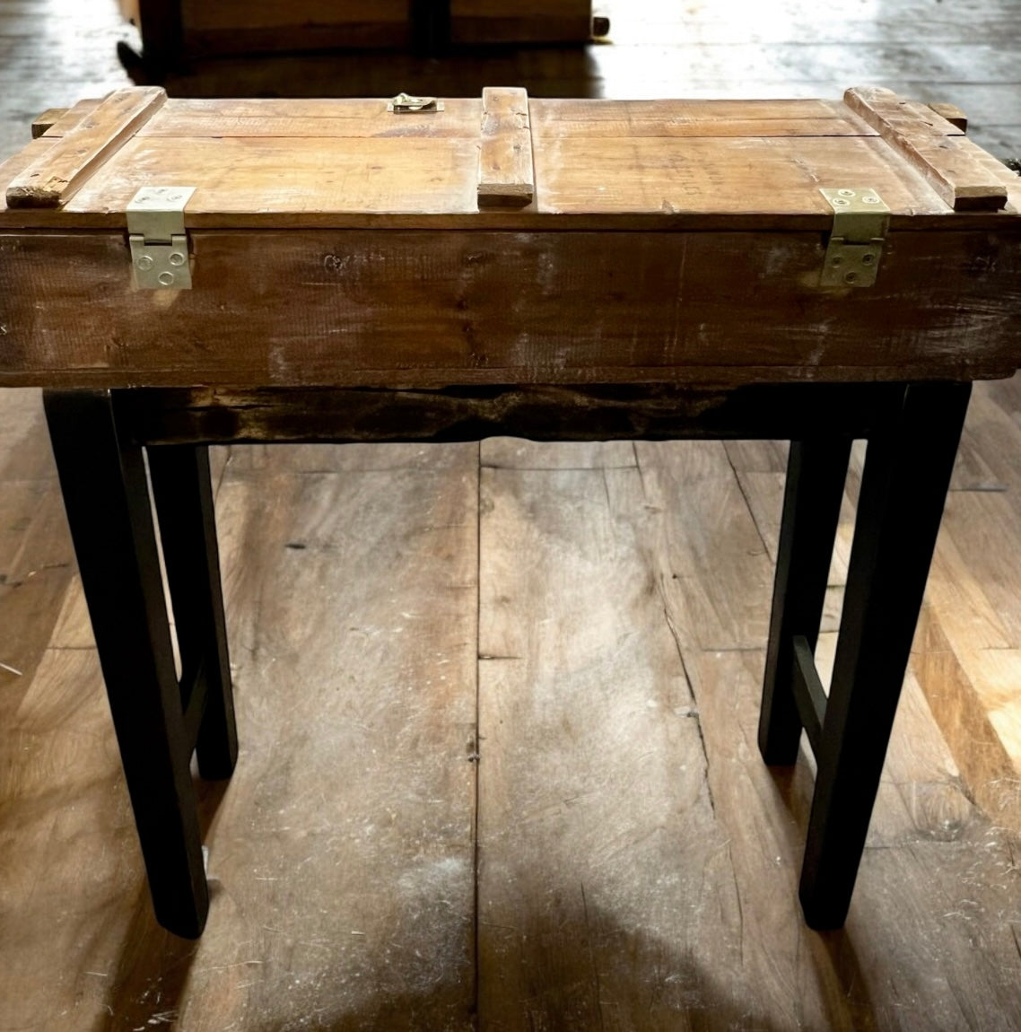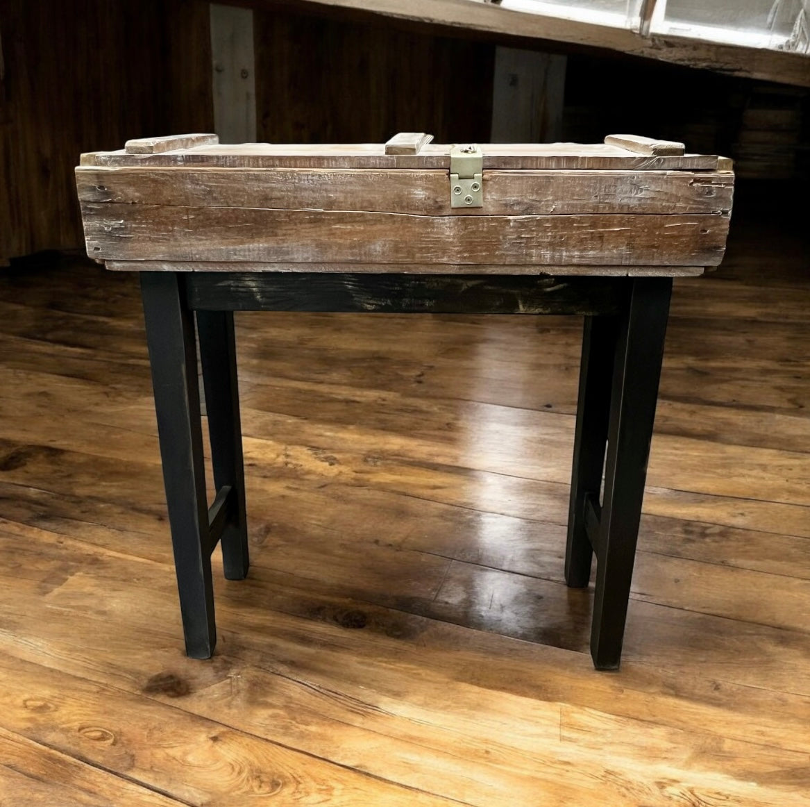 Vintage cannon ammunition box upcycled to make a very cool table. Size 37'x37'x12' wide with solid wood bench and legs. It even has good clean storage. This can be used in so many ways and so in so many decor styles. Great in a Man Cave, too! Oh, and in a hutting cabin to store your ammo in. Original handles, henges and latch!